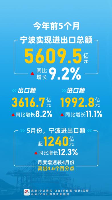 今年前5個月,寧波實現(xiàn)進(jìn)出口總額5609.5億元,同比增長9.2%。其中,出口額3616.7億元,同比增長8.2%;進(jìn)口額1992.8億元,同比增長11.1%。